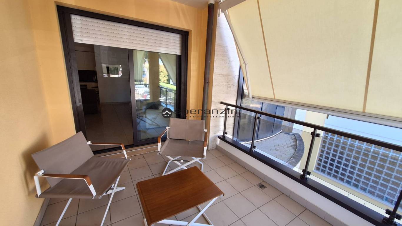 La zona giorno è composta da un ampio soggiorno con affaccio su un terrazzo vivibile con tende, una sala da pranzo con terrazzo e un cucinotto con ulteriore terrazzo dotato di allaccio acqua e predisposizione per termosifone, che offre la possibilità di essere chiuso per ricavare un’ulteriore stanza. La zona notte comprende un disimpegno, una camera matrimoniale, una cameretta o studio e due bagni finestrati, uno con doccia e uno con vasca. Vi è inoltre la possibilità di creare una terza camera da letto. Completa la proprietà ampio garage di circa 30 mq.